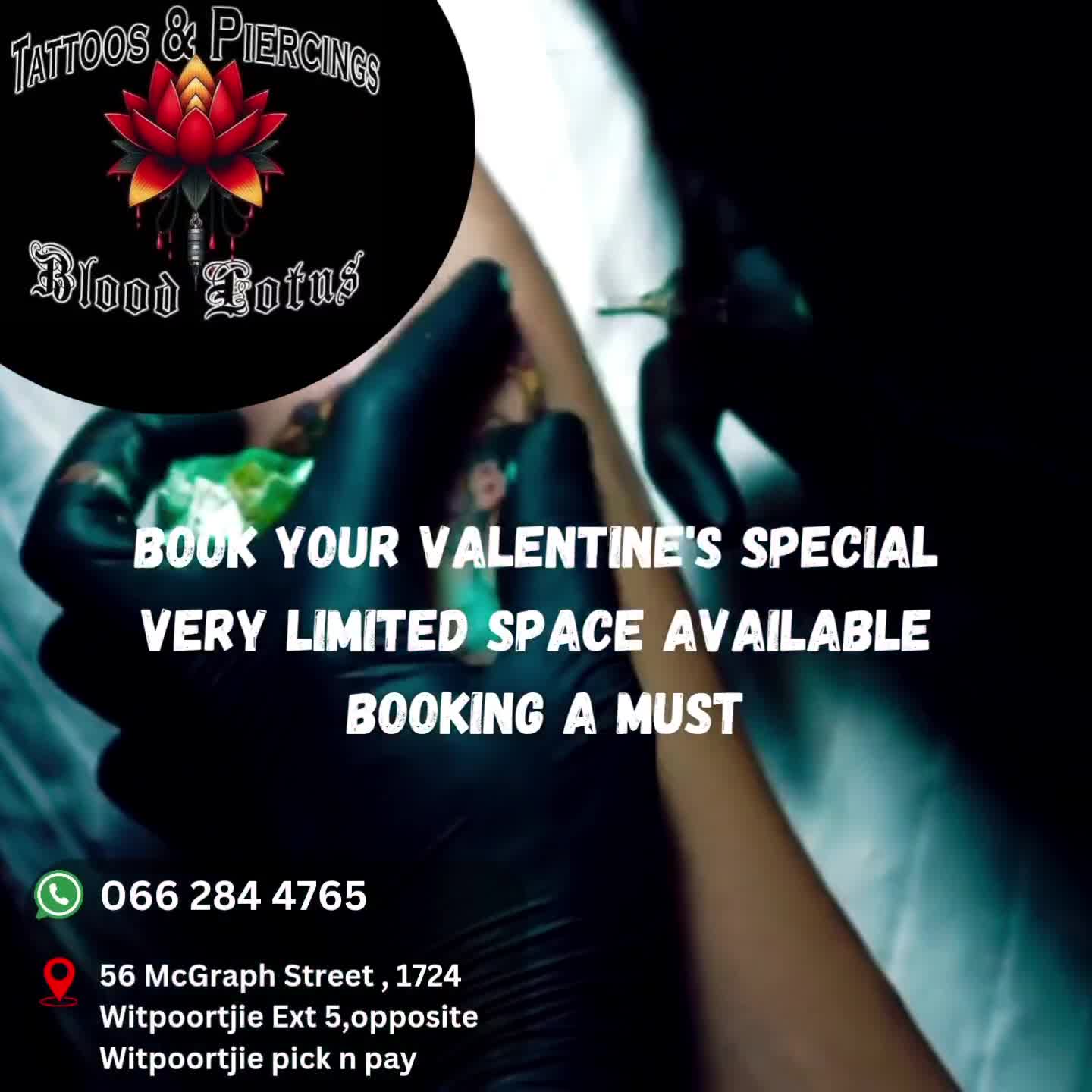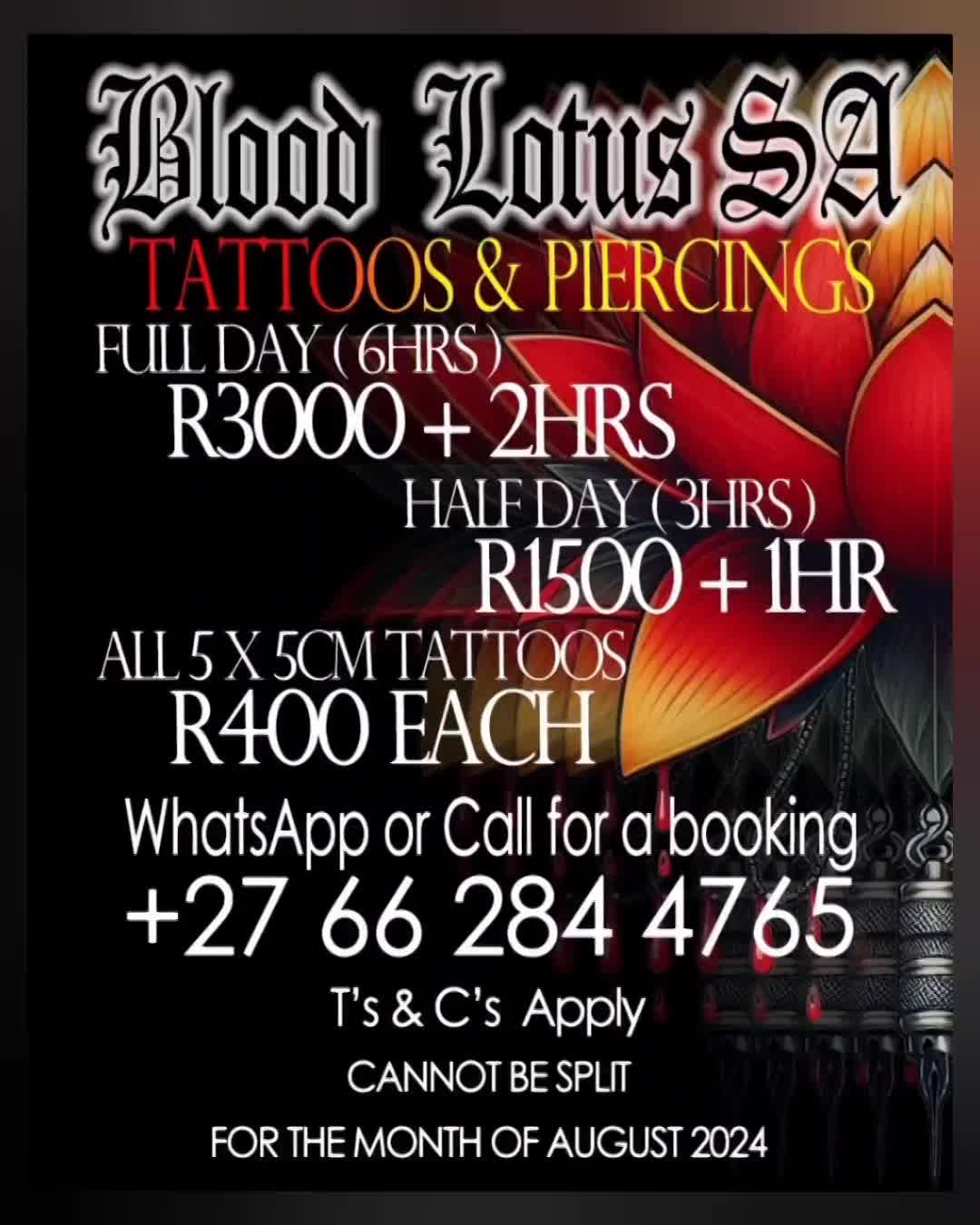 "Blood Lotus Tattoos and Piercings specializes in creating intricate, detailed tattoos that capture personal stories. With over 13 years of experience, this private Mindalore, Krugersdorp studio offers a personalized tattoo experience."